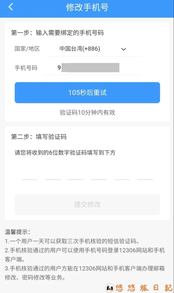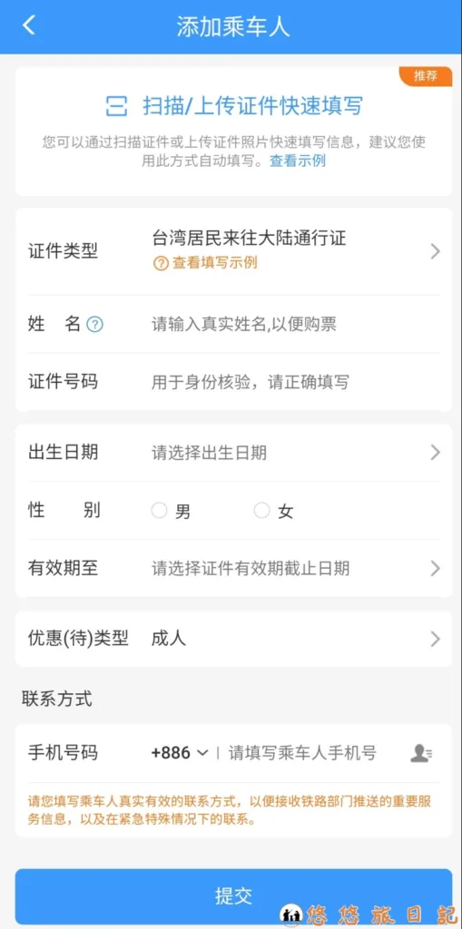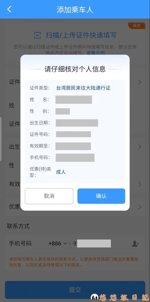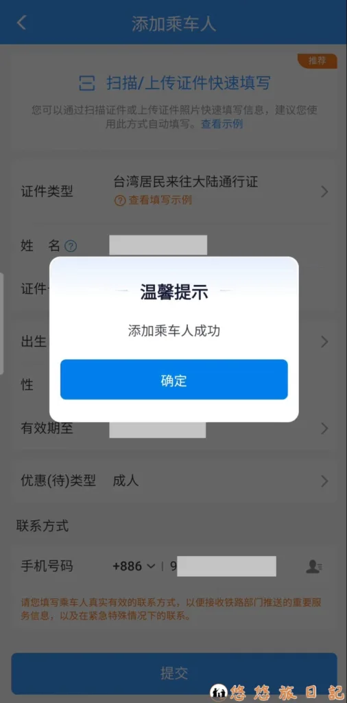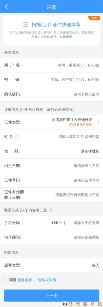 註冊的時候需要輸入的個人資料,所以需要先辦好台胞證、才能註冊中國國鐵的帳號。這邊要特別注意的是「證件類型」記得要切換到「台灣居民往來大陸通行證」,這樣下面的手機號碼才能切換到+886開頭的台灣手機號碼。