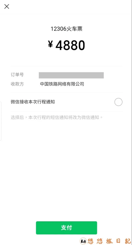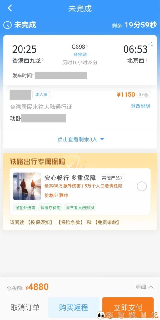按「提交訂單」後會到這個頁面,到這裡代表訂單已經成立了,可以看到自己的車廂號碼、座位號碼(一般火車座位)、鋪位號碼(臥鋪火車)、總金額等資訊,有20分鐘可以決定要不要為這張訂單付款。