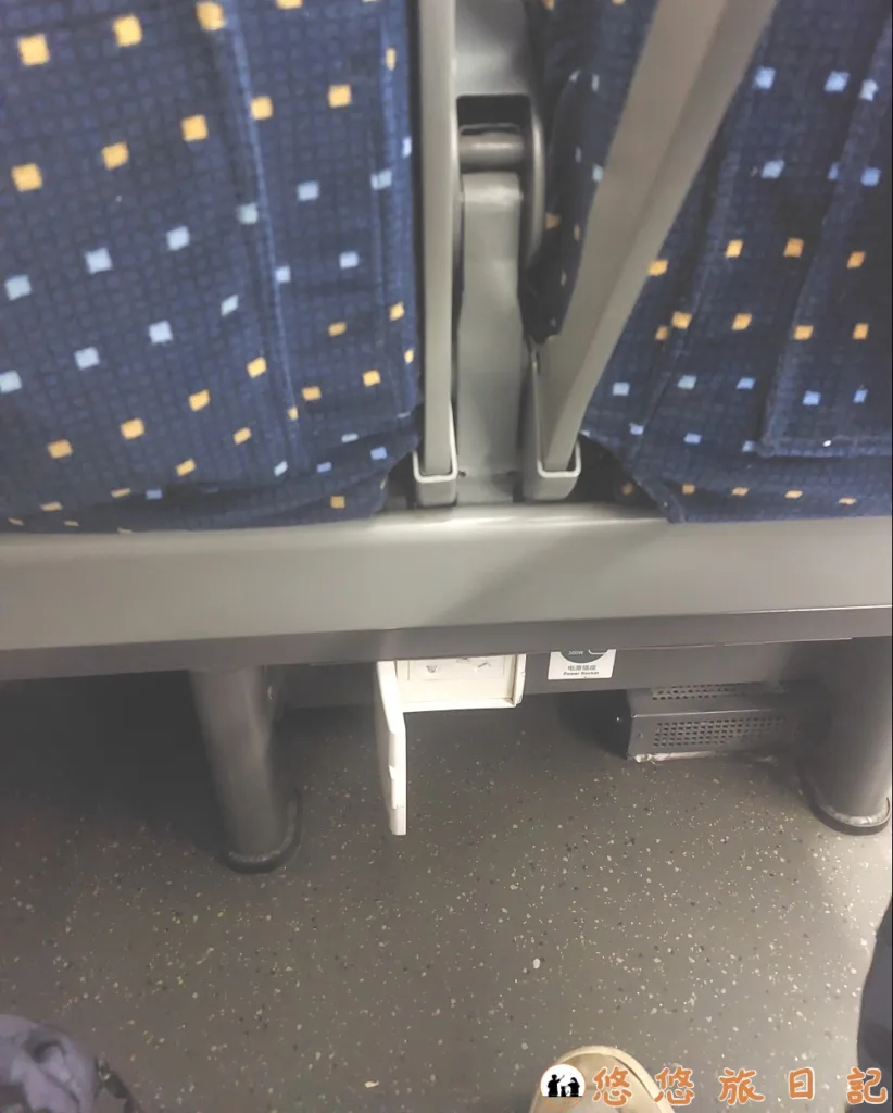 有些火車的座位上會有插座可以充電,位置不一定,可能會在前方座位的底下、也可能在自己座位的底下,但有些火車的座位上就沒有設計插座,要到車廂之間找插座。