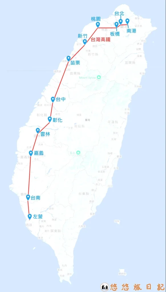 搭高鐵可以超級快速的移動到台灣各大城市,尤其是中南部城市往返桃園機場的交通方式比較少,高鐵就是個很重要的選項,下圖列出了所有的高鐵車站的名字和地點: