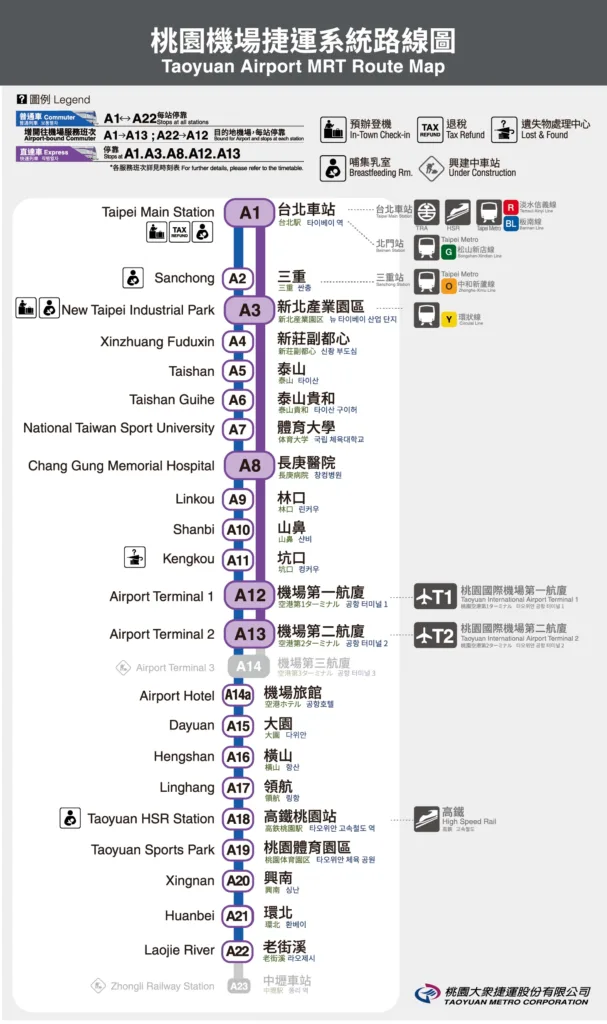 要注意的是桃園機場線捷運有分成兩種:普通車、直達車,普通車是每站都有停,直達車只有停台北車站、桃園機場、高鐵桃園站等等幾個重要車站而已。桃園機場線捷運路線圖如下: