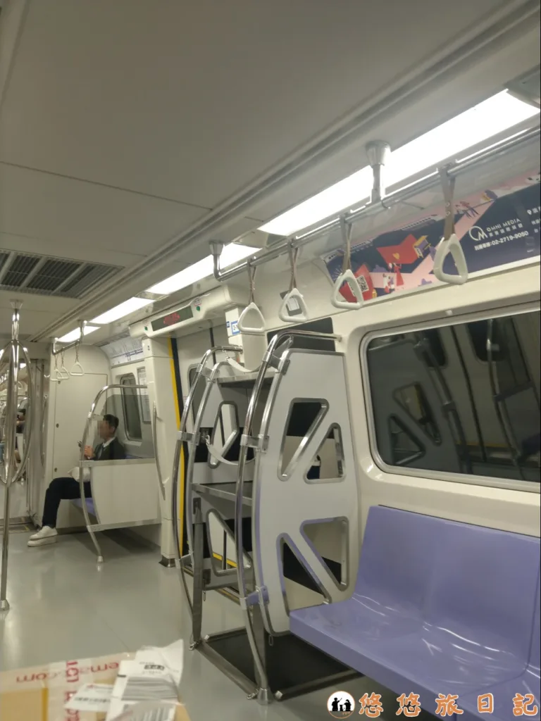 桃園機場線捷運車廂內長這樣,跟其他路線的捷運差不多,都很乾淨明亮、座位也不多為了可以容納更多的乘客,最大特色是有行李架,分成兩層,下層放28吋的大行李箱沒問題,上層還可以放小行李箱。